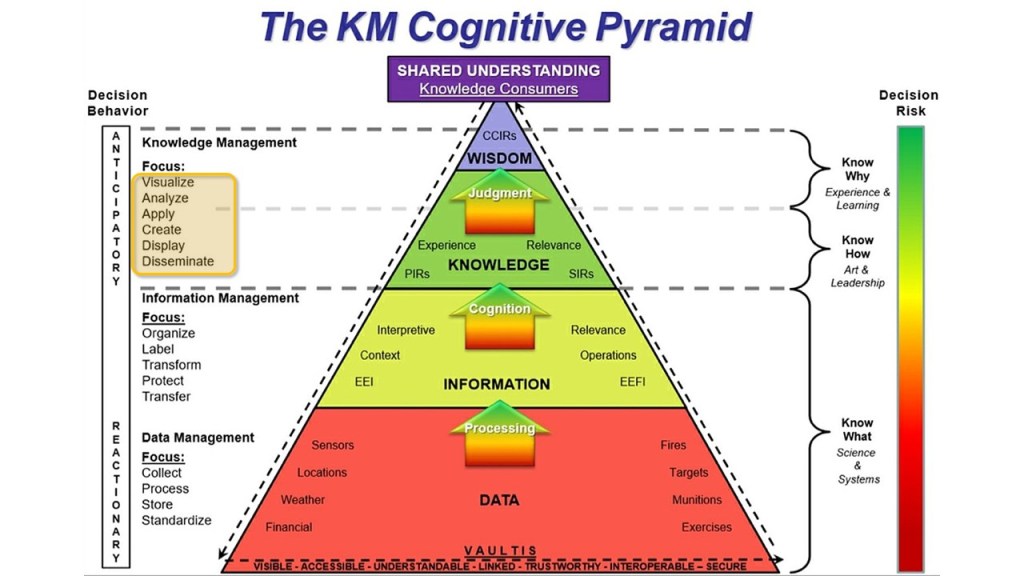 ถ้าพิจารณาจากขึ้นตอนที่เปลี่ยนจาก knowledge เป็น wisdom ใน KM Cognitive Pyramid เราจะเห็นว่ามีเรื่องของการประยุกต์ (apply) การวิเคราะห์ (analyze) การแสดงผล (display) และการแสดงภาพ (visualize) อยู่ด้วย นั่นหมายความว่าหากเราต้องการจะเปลี่ยนผ่านความรู้ไปเป็นปัญญา มันต้องผ่านการวิเคราะห์หาผลเชิงลึก (insights) และผ่านการเล่าเรื่องที่ดีนั่นเอง (storytelling)