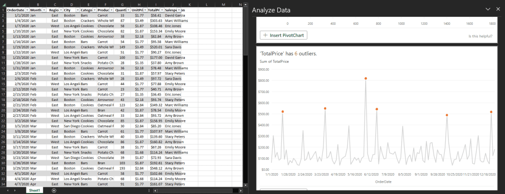 เราสามารถใช้ AI หา Insights ได้ ไม่ว่าจะเป็นการเรียงลำดับข้อมูล การหาค่าผิดปกติ (outlier) แถมยังมีความเข้าใจภาษาด้วย คือเราสามารถพูดถึงตัวแปร 2 ตัวแล้วให้มันช่วยสร้างกราฟให้ก็ได้ หรือถ้าคิดอะไรไม่ออกก็ให้ Excel วิเคราะห์ให้เลยก็ยังได้